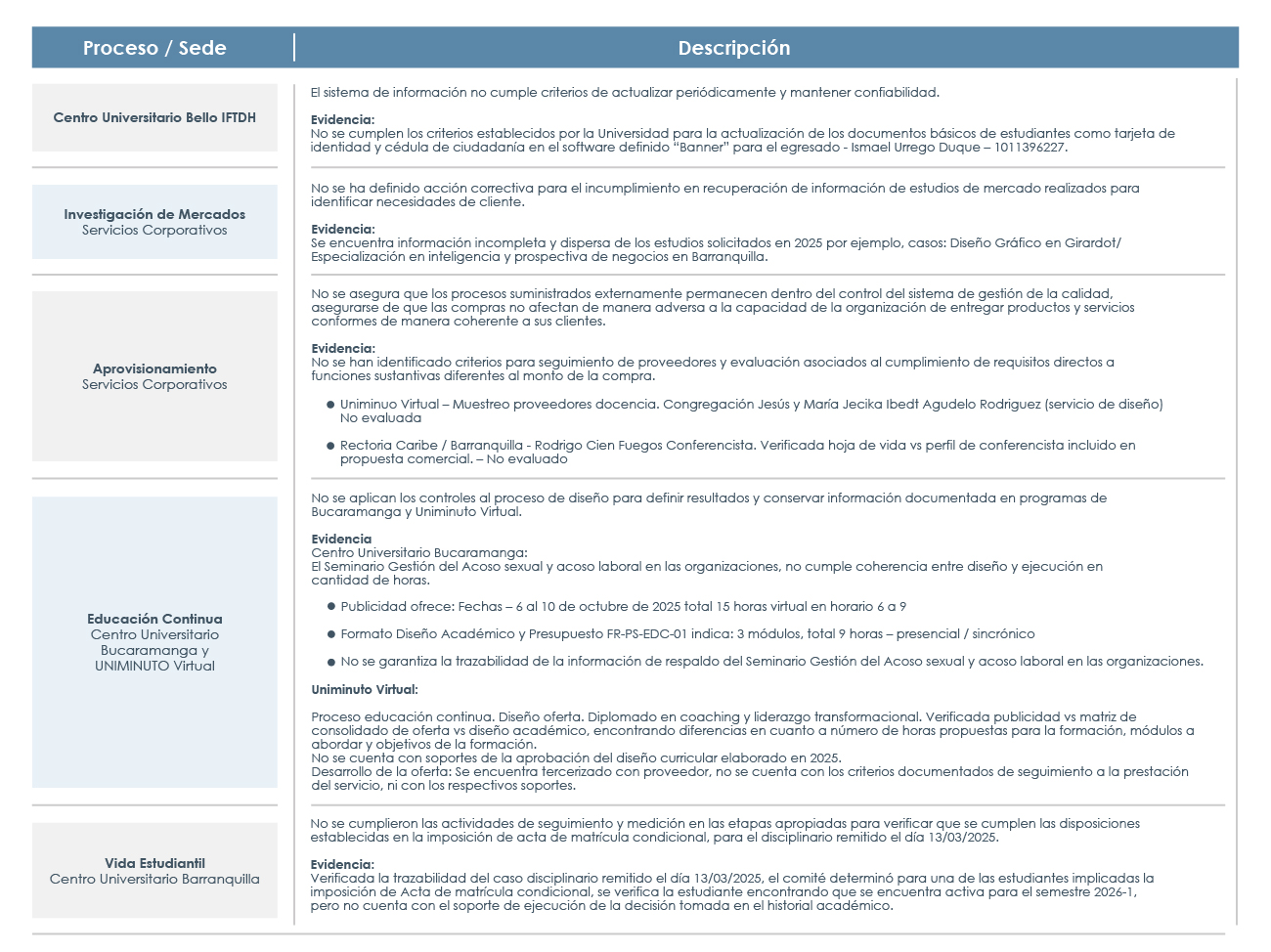 De igual manera, en los próximos días se procederá con el registro de las Oportunidades de Mejora pertinentes en ISOLUCION, garantizando que los planes de acción formulados trasciendan el cumplimiento formal de los requerimientos de ICONTEC y se fundamenten en análisis sólidos y diferenciados, con responsables claramente definidos, plazos y mecanismos efectivos para la verificación de su eficacia.